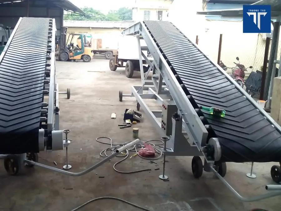 Băng tải di động: Sở hữu hệ thống bánh xe chịu lực, giúp dễ dàng di chuyển giữa các khu vực kho bãi, đặc biệt thuận tiện cho công tác bốc xếp hàng hóa lên xe tải hoặc container ngoài trời.