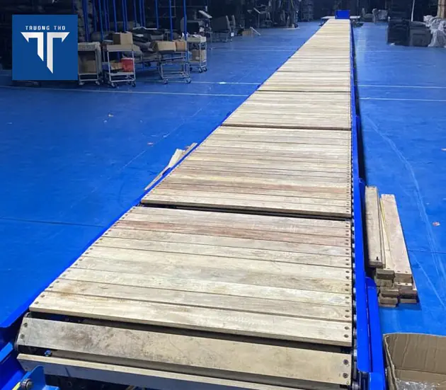 Dây xích tải gỗ: Các thanh gỗ được cố định trên xích bằng tay đỡ và thanh chặn, giúp giữ sản phẩm ổn định khi di chuyển.